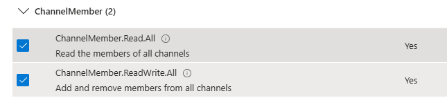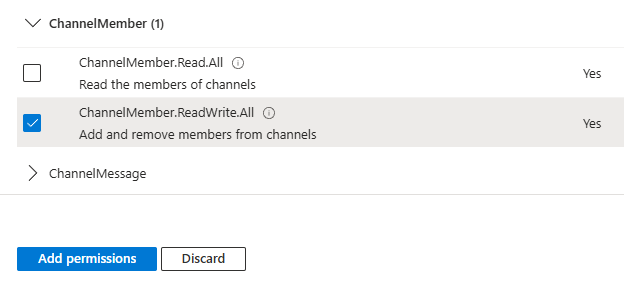 | ChannelMember.ReadWrite.All | Application and Delegated | ||