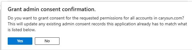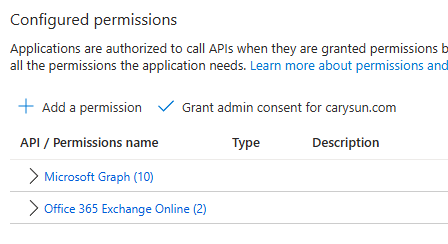 75. Click Grant admin consent for the domain name (carysun.com) on the Configured permissions page.