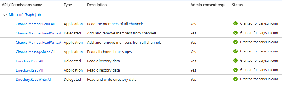 | Microsoft Teams | Microsoft Graph | Directory.Read.All | Application and Delegated |