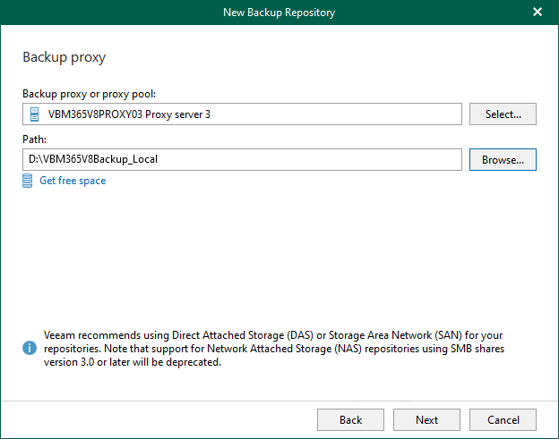 11. On the Backup proxy page, click Get free space to know the available space on the selected backup proxy server.