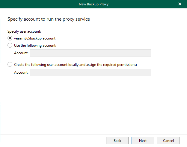 12. Select the veeam365backup account on the Specify account to run the proxy service page and click Next.