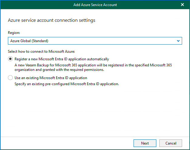 68. Select Register a new Microsoft Entra ID application automatically on the Azure service account connection settings page and click Next.