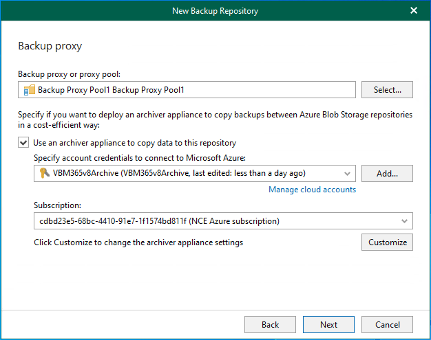 67. On the Backup proxy page, select Use an archiver appliance to copy data to this repository and click Add to specify account credentials to connect to Microsoft Azure.