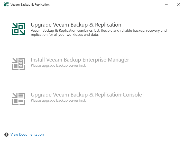 14.Select Upgrade Veeam Backup & Replication on the Veeam Backup & Replication page.
