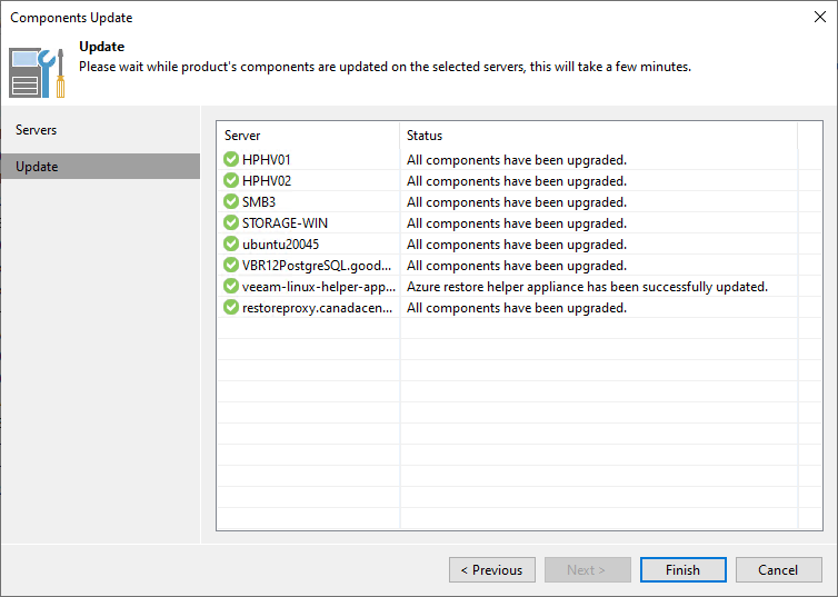 24.On the Components Update page, ensure all components are updated successfully for all servers and click Finish.