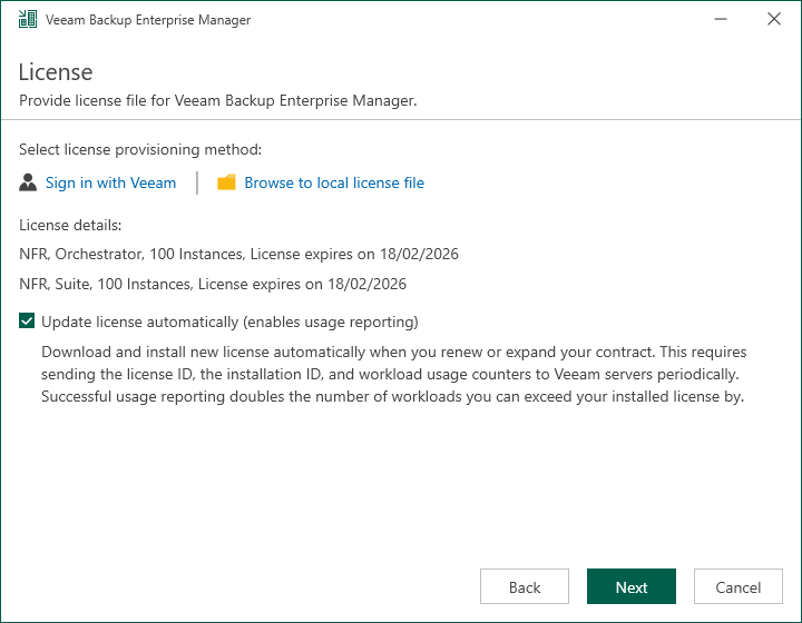 9.The setup wizard will inform you if a valid license is installed on the machine. In this case, you can skip the Provide License step and click Next.