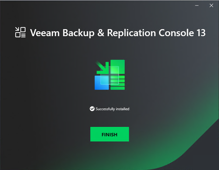 14.Click Finish on the Veeam Backup & Replication Console 13 Successfully installed page.
