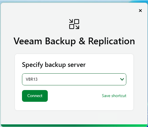 15.Open the Veeam Backup & Replication Console 13, enter the Backup & Replication Manager server name or IP address, and click Connect.