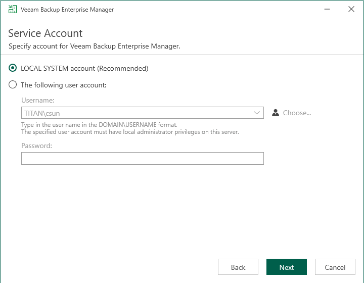 The user account must have Veeam Backup Enterprise Manager service account permissions to run the Veeam Backup Enterprise Manager Service.