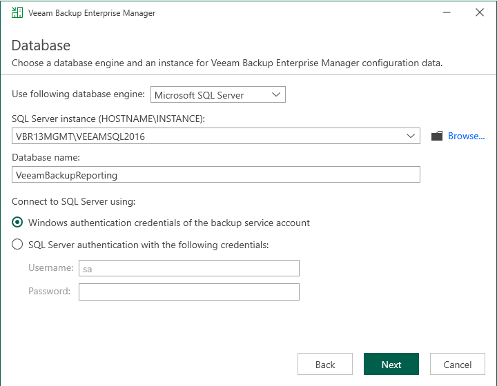 24.Enter the instance name in the HOSTNAME\INSTANCE format. In the Database name field, enter the name for the Veeam Backup Enterprise Manager Reporting database.