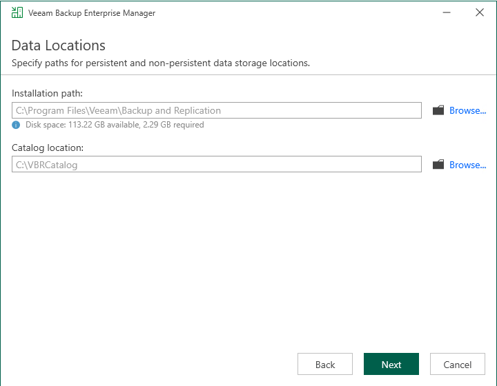 26.On the Data Locations page, select the locations for the installation and Catalog path and click Next.