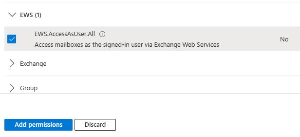 66. Select EWS.AccessAsUser.All and click Add permissions.