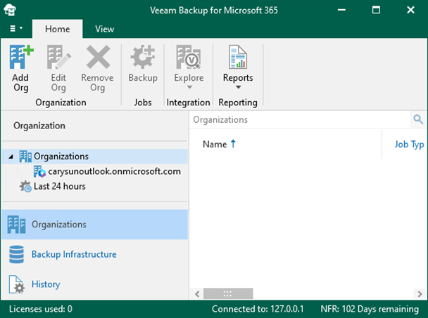 87. On the Veeam Backup for Microsoft 365 Console page, right-click Organizations and select Add an organization.