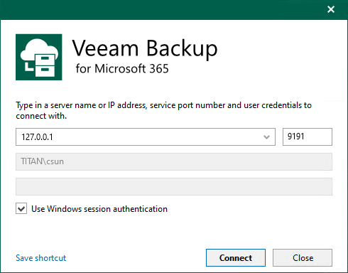 2. Open the Veeam Backup for Microsoft 365 console and click Connect.