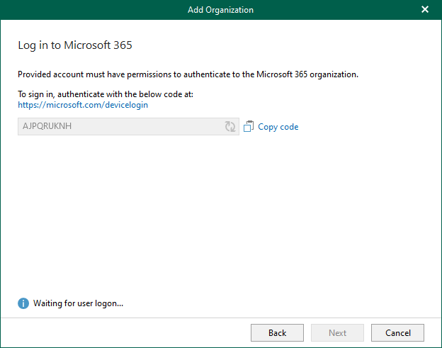 13. Click copy code on the Log in Microsoft 365 page and click the sign-in link.