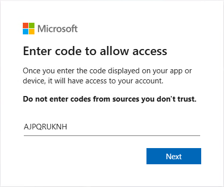 14. Enter the code on the Enter code to allow access page and click Next.