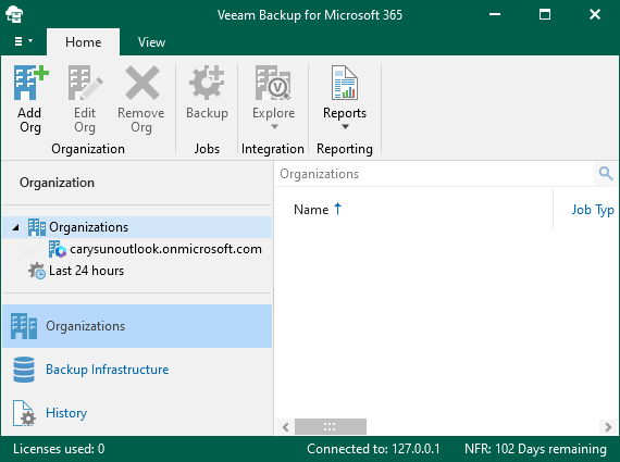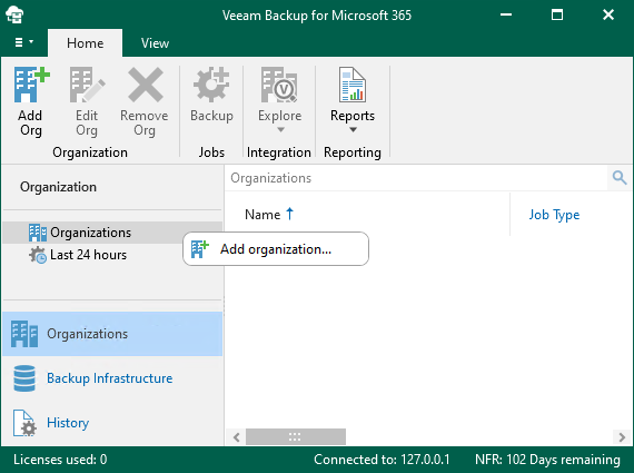 3. On the Veeam Backup for Microsoft 365 console page, right-click Organizations and select Add an organization.