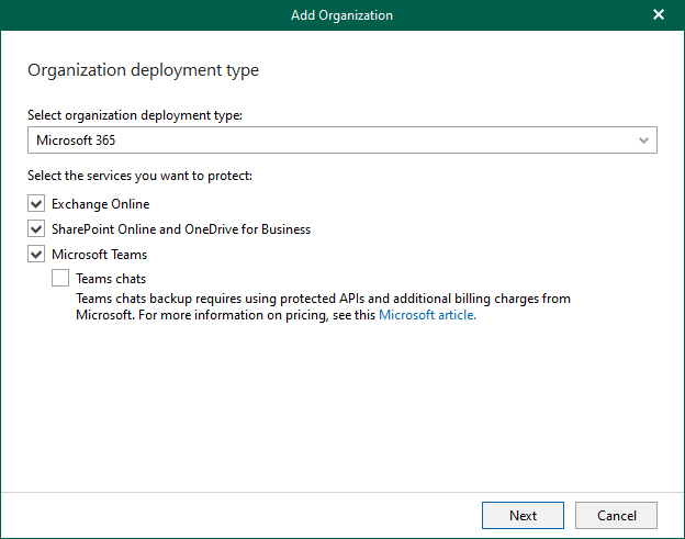 Registering a new Microsoft Entra ID application automatically is unavailable if you want to back up team chats and have selected Team chats at the Organization Deployment Type step.