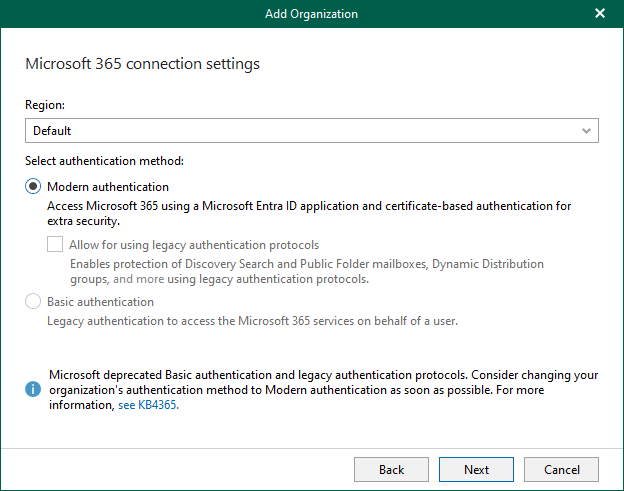 5. On the Microsoft 365 connection settings page, select Default as Region.