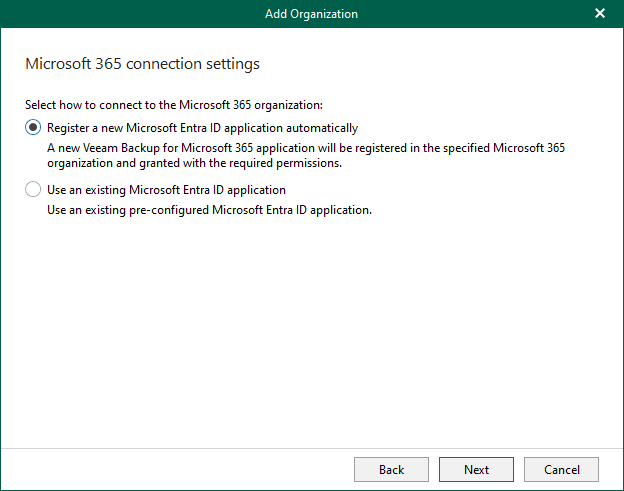 7. On the Microsoft 365 connection settings page, select Register a new Microsoft Entra ID application automatically and click Next.