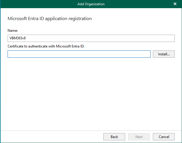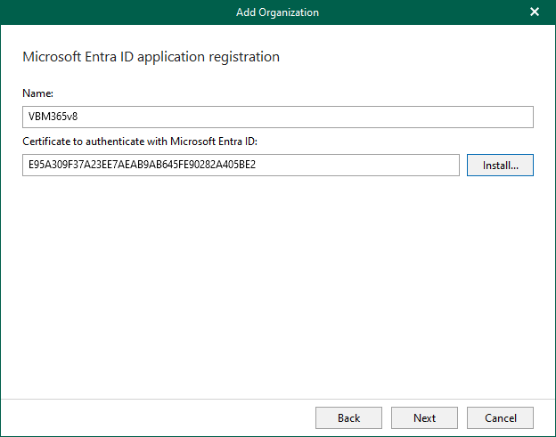 9. Click Install to specify an SSL certificate you want to use for data exchange between Veeam Backup for Microsoft 365 and a Microsoft Entra application.