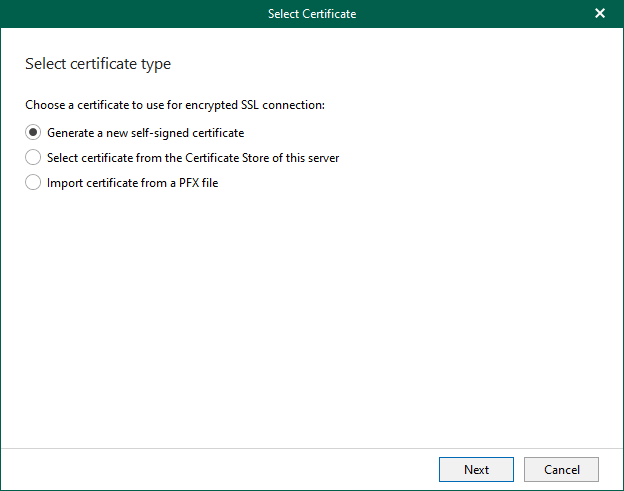 10. Select Generate a new self-signed certificate on the Select certificate type page and click Next.