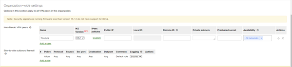 If the Cisco Meraki Security appliances running firmware less than version 15.12 do not have support for IKEv2. Also, there is a bug at concurrent firmware 14.53 (confirmed by Meraki support engineer), when you build up a VPN non-Meraki peer with Azure, the all auto VPN peers will down and won’t come back on line until you reboot the security appliance. Everything will be fine after reboot it.