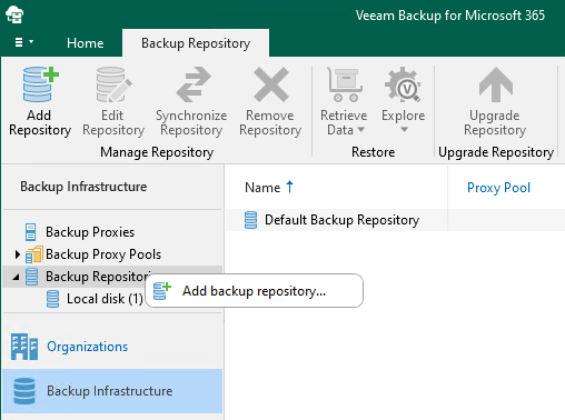 4. On the Backup Infrastructure page, right-click Backup Repositories and select Add backup repository.