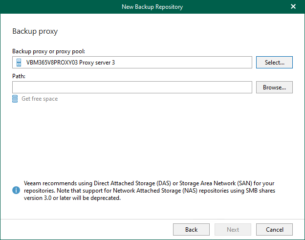 11. On the Backup proxy page, click Get free space to know the available space on the selected backup proxy server.