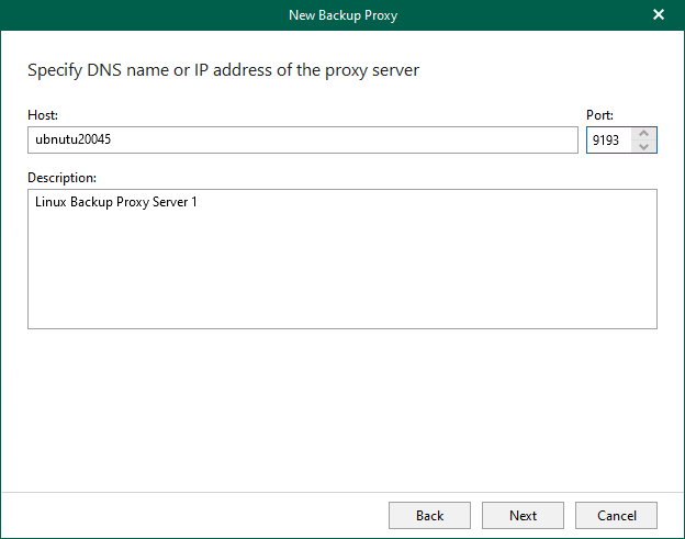 6. In the Host field, enter a DNS name or IP address of a computer you want to use as a backup proxy server, and click Next.