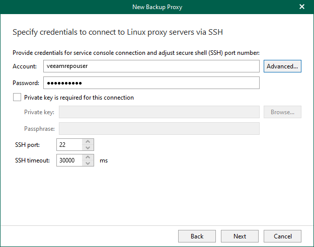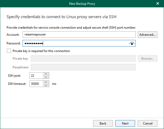 7. On the Specify credentials to connect to Linux proxy servers via SSH page, enter a user name in the Account field.