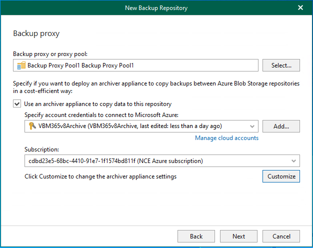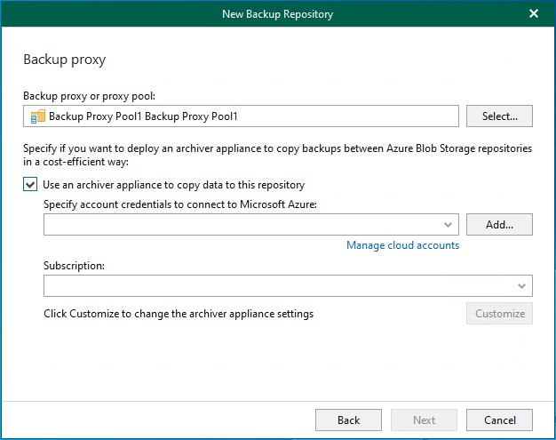 67. On the Backup proxy page, select Use an archiver appliance to copy data to this repository and click Add to specify account credentials to connect to Microsoft Azure.