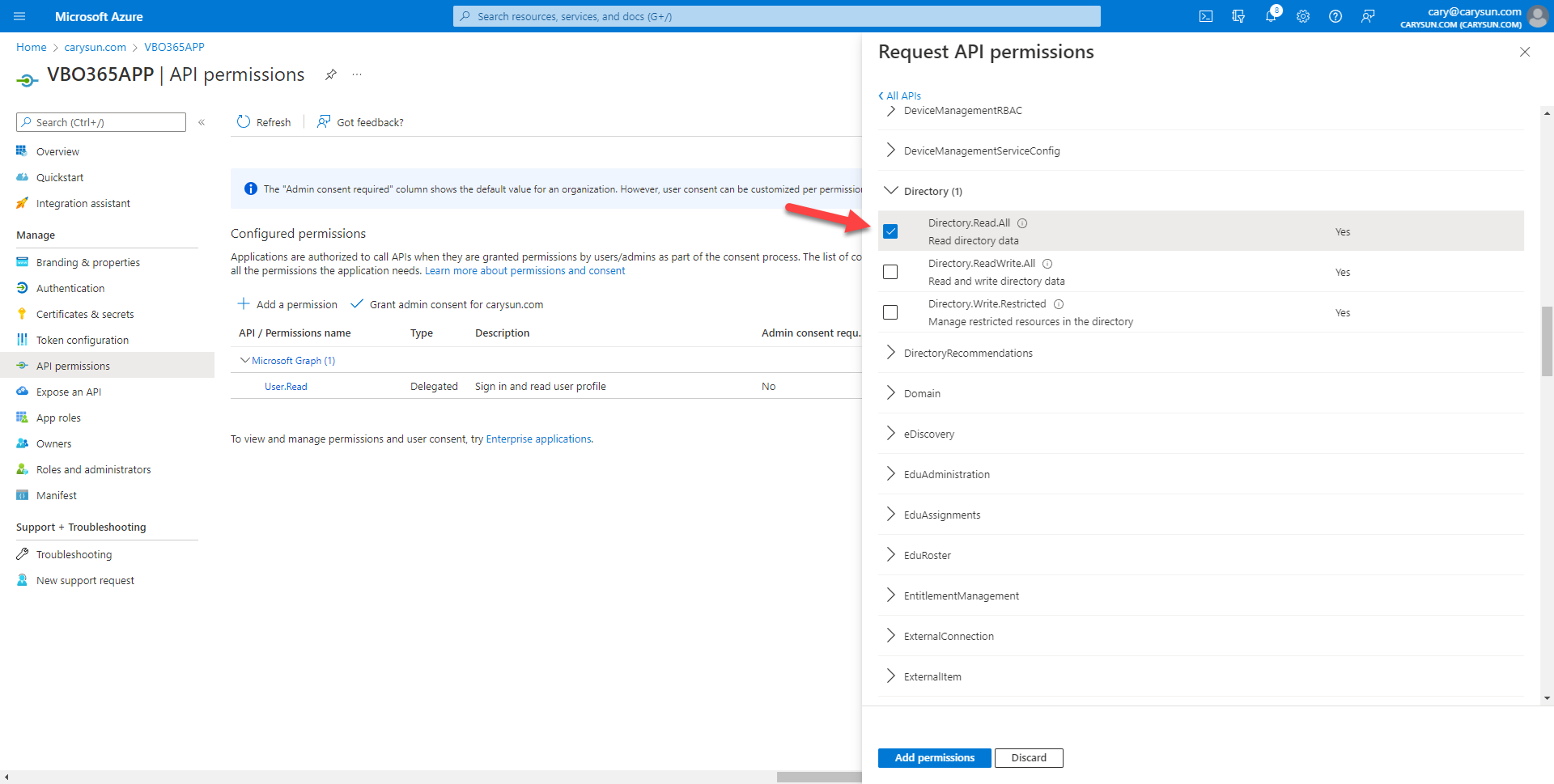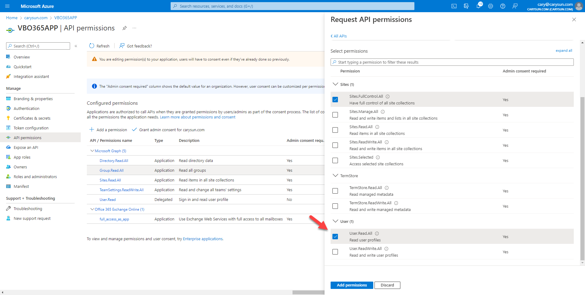 45.On the Configured permissions page, click Grant admin consent for domain name (in my case is carysun.com).