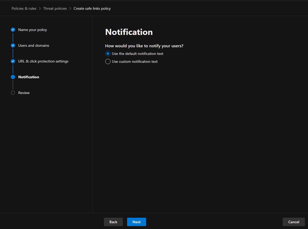 12.On the Notification page, click Next to use the default notification text. You also could define your own.