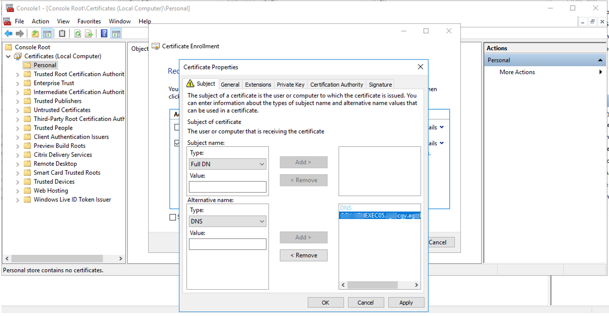 12.On the Certificate Properties page, click Subject, at the Alternative name field, select DNS Type and enter the storefront server internal FQDN in the Value, click Add.