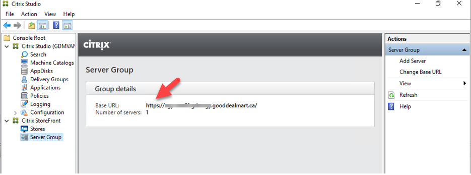 27.Open Citrix Studio, under the Citrix StoreFront, select Server Group, click Change Base URL.