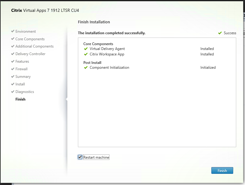 52. On the Finish Installation page, select Restart machine, click Finish.
