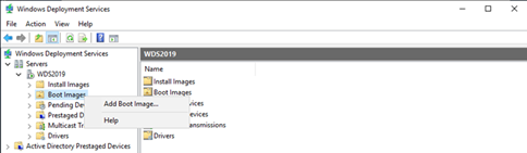 On the Windows Deployment Services page, expend WDS2019 and right click Boot Images, click Add Boot Image.