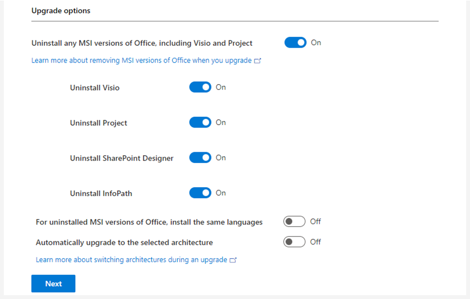 12. Keep the default settings on the Upgrade options session and click Next.