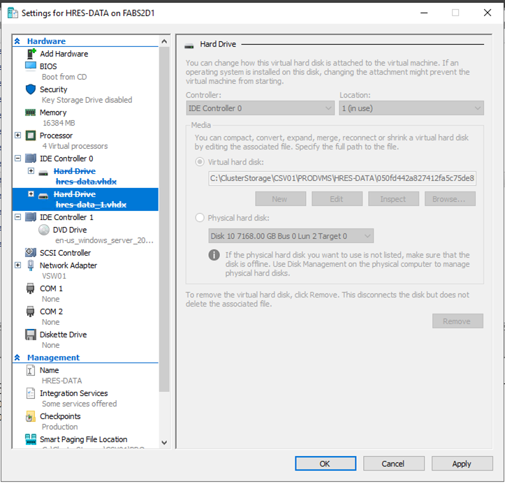 67.Expand IDE Controller 1 on the Hardware page, select the windows 2012 R2 D drive hard Drive and click Remove.