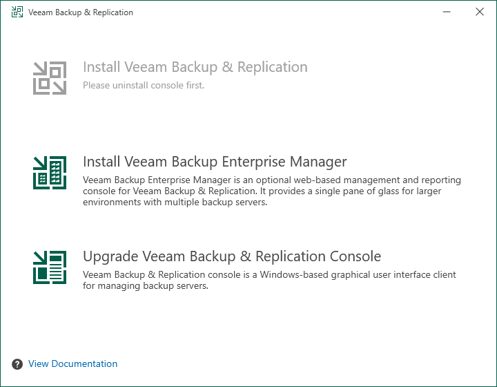 7.On the Veeam Backup & Replication page, select Upgrade Veeam Backup & Replication Console.