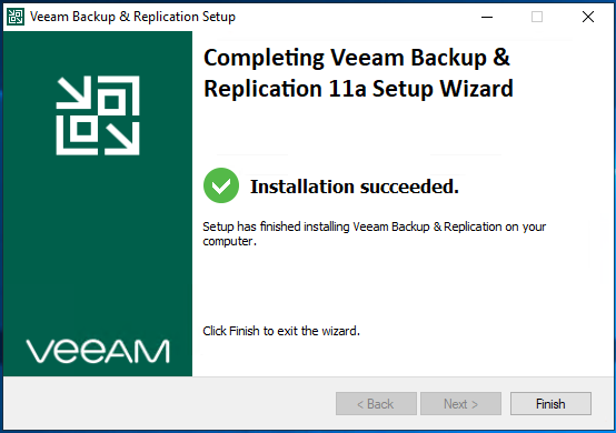 24.On the Completing Veeam Backup & Replication 11a Setup Wizard page, make sure installation succeeded, click Finish.