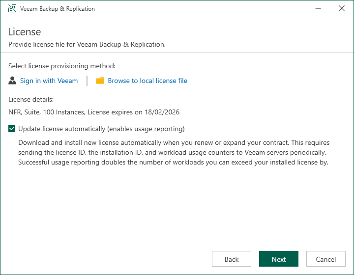 16.The setup wizard will inform you if a valid license is installed on the machine. In this case, you can skip the Provide License step and click Next.