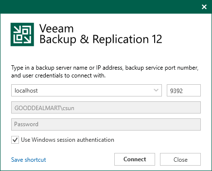 3.Open the Veeam Backup & Replication 12 Console and click Connect.