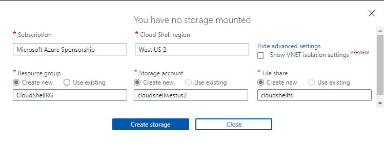 - Storage account: Select Create new, type storage account name, in my case is cloudshellwestus2.