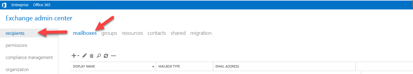 3.On the Exchange admin center, select recipients, click mailboxes.