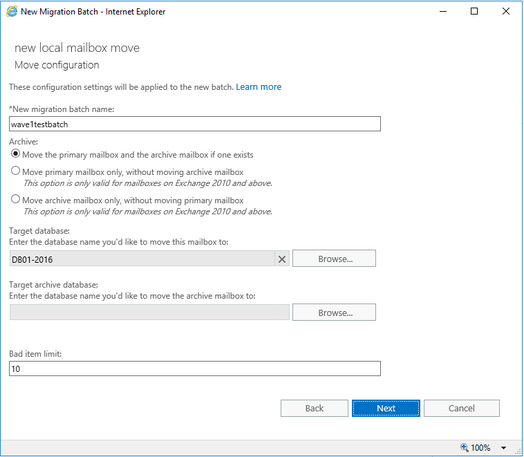 13.On the Move configuration page, type the batch name in the New migration batch name, select Move the primary and archive mailbox if one exists, click Browse at Target database.