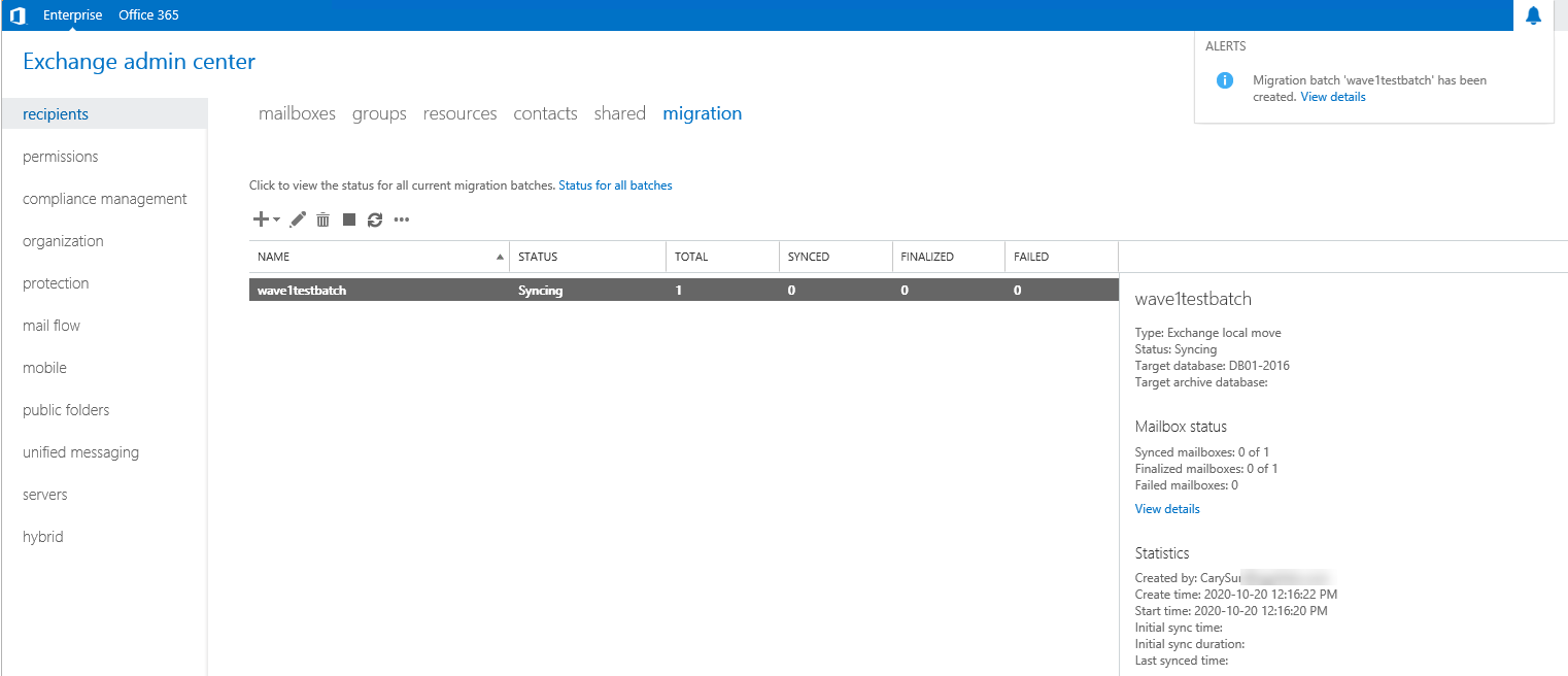 16.On the Start the batch page, you must select at least one recipient to receive the batch report, select Atomically start the batch, select Automatically complete the migration batch, click new.