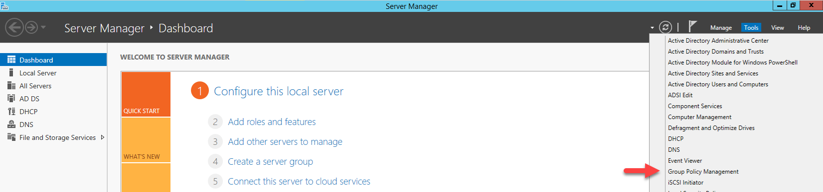 14.Open Server Manage, select Tools, click Group Policy Management.