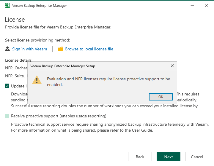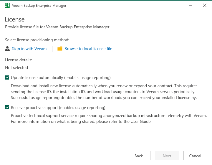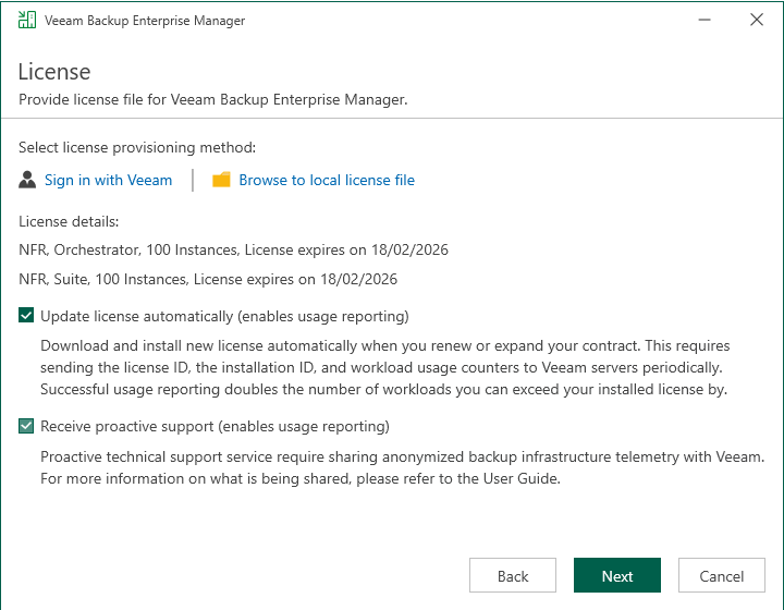 12.If you use Evaluation, Free, and NFR licenses, you must select the Receive proactive support (enable usage reporting).